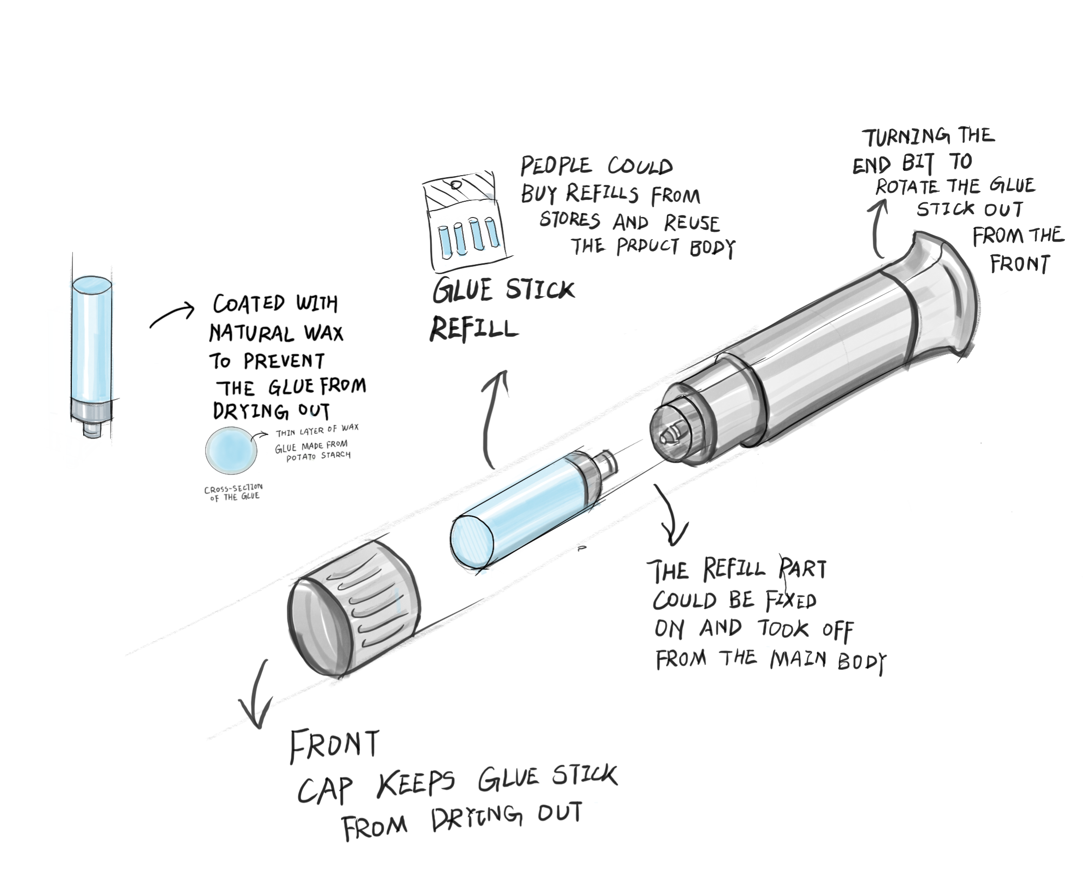 There are some existing product service systems such as Terracycle that aim to recycle goods such as glue sticks. Terracycle provides two options. The first option is for the consumer to take the product to a Terracycle location and put it in a box, where the box is then sent to Terracycle where products such as glue sticks are separated by material composition, cleaned and melted into hard plastic that can be remoulded to make new recycled products. The second option aimed at establishments is to buy a zero-waste box, from 180 to 280 pounds, and fill it with empty glue sticks (or other glue containers) and then post it for free to Terracycle. However, this is inconvenient for users which reinforces the high amount of glue sticks that end up in general waste.